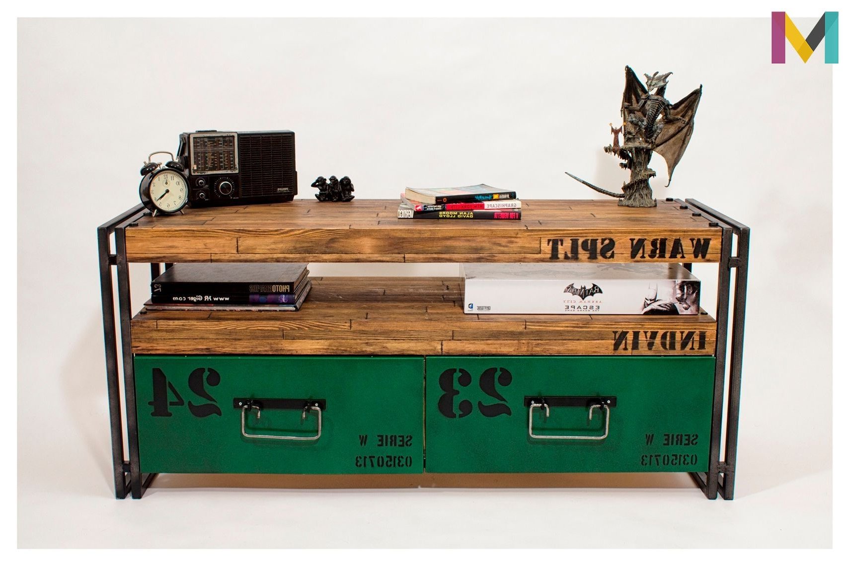 1. kalite masif çam ağacı ve çelik kullanılarak üretilmiş özel tasarım bir üründür. Televizyon ünitesi olarak kullanabileceğiniz gibi, konsol, kitaplık ya da antrenizde şık bir ayakkabılık olarak da kullanabilirsiniz. Tamamen el yapımı olan bu üründe hiç bir şekilde sunta, mdf ya da kaplama kullanılmamıştır. Doğal balmumu cila ile kaplıdır.